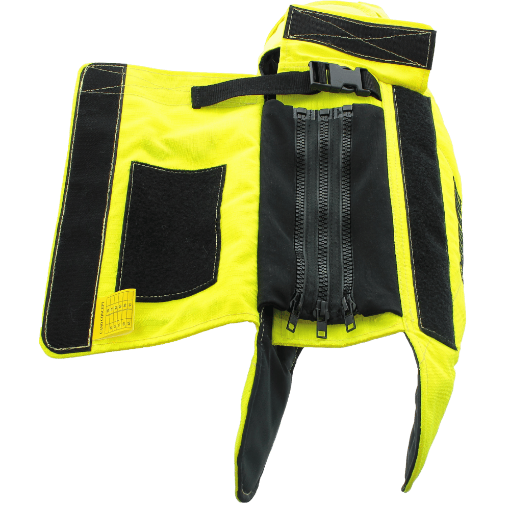 - Halsschlaufen: Außen am Halsteil befindliche Schlaufen für zusätzliche Halsbänder bieten optionalen Schutz vor versehentlichem Öffnen der Weste.