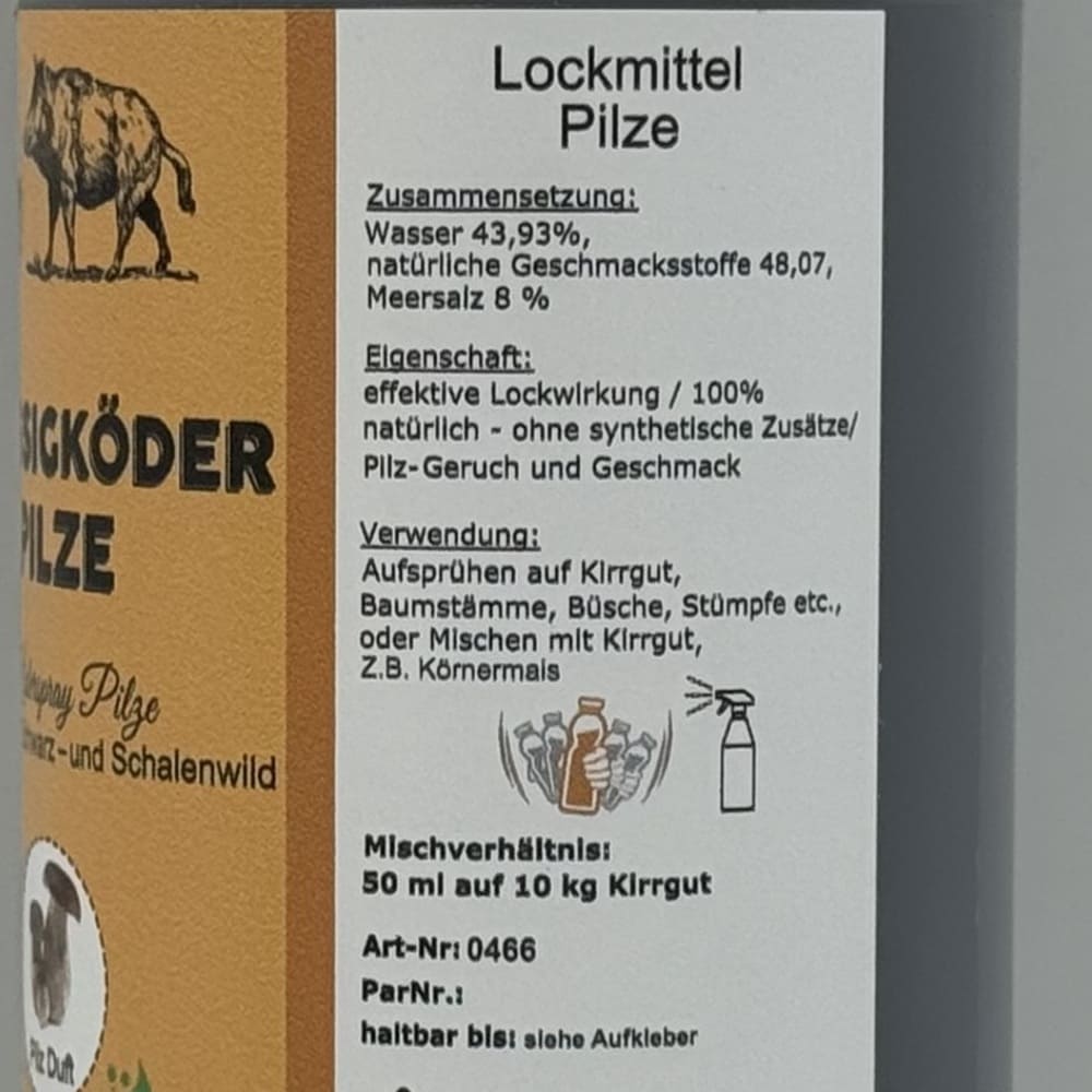 Dieser Flüssigköder hat sich in zahlreichen Praxistests bewährt und bietet einen extrem intensiven Pilz-Duft, der über lange Distanzen wahrgenommen wird. Er zieht Schalenwild und Schwarzwild an und sorgt für eine starke magnetisierende Wirkung.