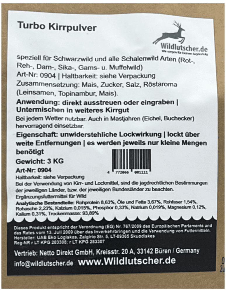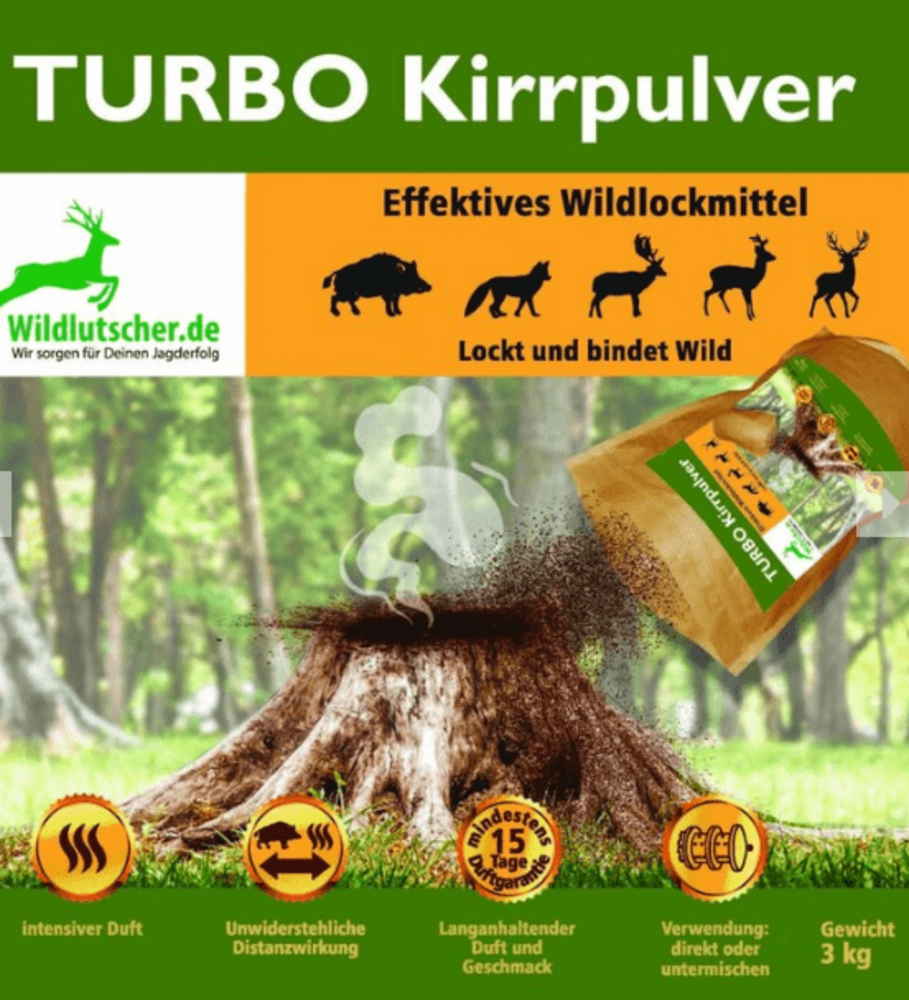 Mit dem Wildlutscher Turbo Kirrpulver hast Du ein äußerst wirkungsvolles Lockmittel, das Wild zuverlässig über weite Distanzen anzieht und langfristig bindet.